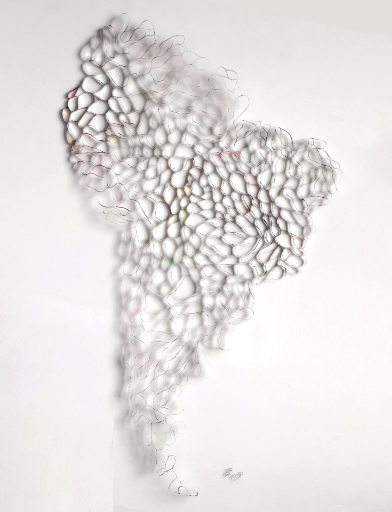 Con actitud reparadora, Gabriela Antenzon utiliza la lata y otros desperdicios del consumo para dar origen a células de creación, pacientemente unidas para conformar un país que es capaz de brillar en un juego infinito de reflejos y movimientos. Fortalecidas por su vínculo, se elevan abriendo múltiples caminos, formas y existencias posibles despertando nuestra imaginación. Con voluntad creadora y sensibilidad para ver la potencialidad de belleza allí donde otros ven lo descartable, su obra es una invitación a pensarnos solidariamente unidos en una red de posibilidades creativas a partir de mínimos elementos.